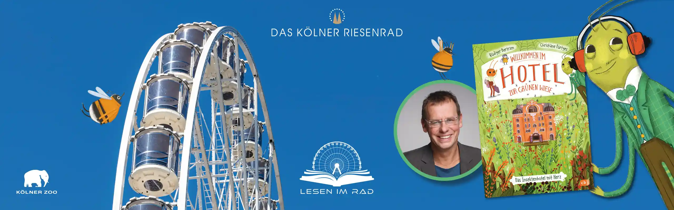 Wir steigen ein, schweben über den Kölner Zoo und lauschen live über Kopfhörer dem Autor, der uns seine Geschichte “Willkommen im Hotel Zur Grünen Wiese” vorlesen wird. Rüdiger Bertram – Lesekünstler des Jahres 2022 – nimmt uns mit durch sein Werk und erzählt uns die Geschichte von Adlon, der Grashüpfer und Hotelmanager zugleich ist.